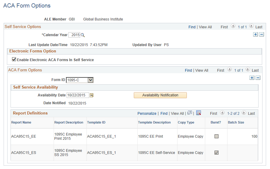 Use the ACA Form Options page (ACA_YE_XMLP_OPTION) to define the various Self Service options for ACA forms. An Administrator can use this page to enable the electronic option for Form 1095-C, and to release the forms for viewing and printing.