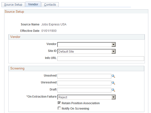 Use the Recruitment Sources - Vendor page (HRS_SOURCE_VNDR) to identify a third-party vendor and enter additional processing rules for vendor recruitment sources.