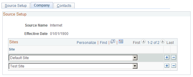 Use the Recruitment Sources - Company page (HRS_SOURCE_CMPNY) to define sites for a company recruitment source.