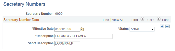 Use this page to specify 4-digit secretary numbers and their corresponding descriptions. The system delivers a list of secretary numbers that are ready for use when you enter family dependents data for employees on the Dependent Information - Personal Profile Page.