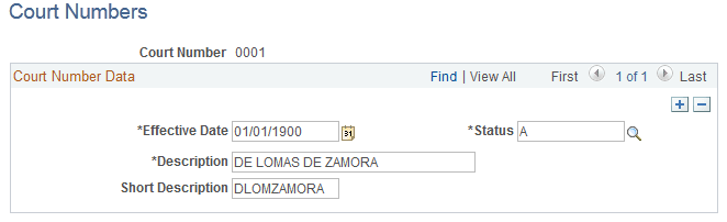 Use this page to specify 4-digit court numbers and their corresponding descriptions. The system delivers a list of court numbers that are ready for use when you enter family dependents data for employees on the Dependent Information - Personal Profile Page.