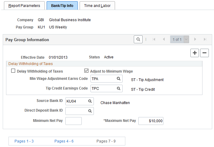 Specify the bank from which employees are to be paid. Establish tips processing for tipped employees within the pay group. |
