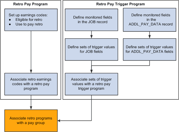 The following diagram illustrates the steps for defining retro programs and associating them with pay groups: