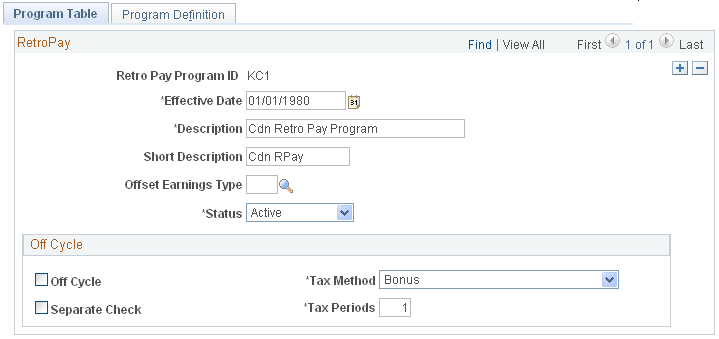 Use the Program Table page (RETROPAY_PGM_TBL) to describe a retro pay program and specify paysheet processing options.