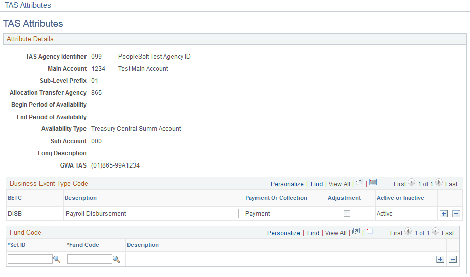 TAS Components: TAS components are eight meaningful pieces of business data that combine to identify a U.S. Treasury account. The components (attributes) are joined with a Business Event Type Code (BETC) to report Federal government financial transactions. TAS components provide Federal agencies and Treasury the ability to sort, filter, and analyze data based on each independent piece of the componentized TAS. In PeopleSoft, the two key value components are the TAS Agency Identifier code and the TAS Main Account code. You must associate the other six components with the agency and main account combination, and specify at least one BETC to create a componentized TAS. PeopleSoft leverages the use of accounting fund codes associated with the componentized TAS to link the TAS to payroll activities.