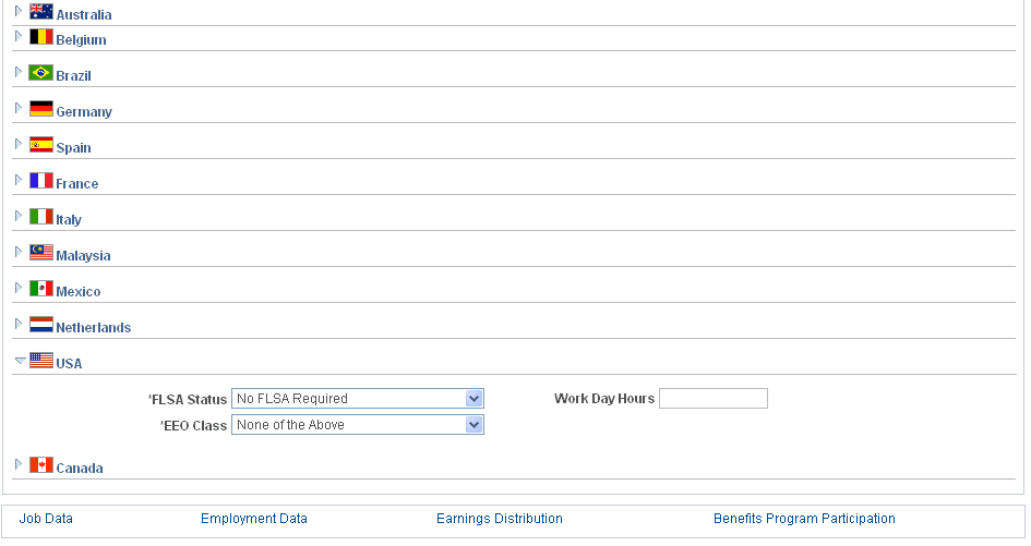 Note: This step is employee-specific. Complete the USA section of the Job Information page when you hire an employee.