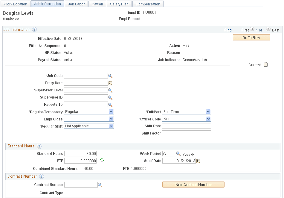 Use the Job Information page (JOB_DATA_JOBCODE) to enter information about a person's job, including status, employee class, shift, or standard hours.