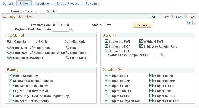 This example illustrates the fields and controls on the Earnings Table - Taxes page.
