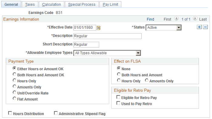 This example illustrates the fields and controls on the Earnings Table - General page.
