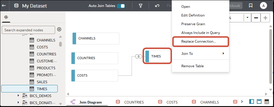 データセット内の表の接続およびデータベース・スキーマの詳細を更新できます。 たとえば、開発データベースから本番データベースに切り替えたり、データを別のデータベースに移行したりできます。