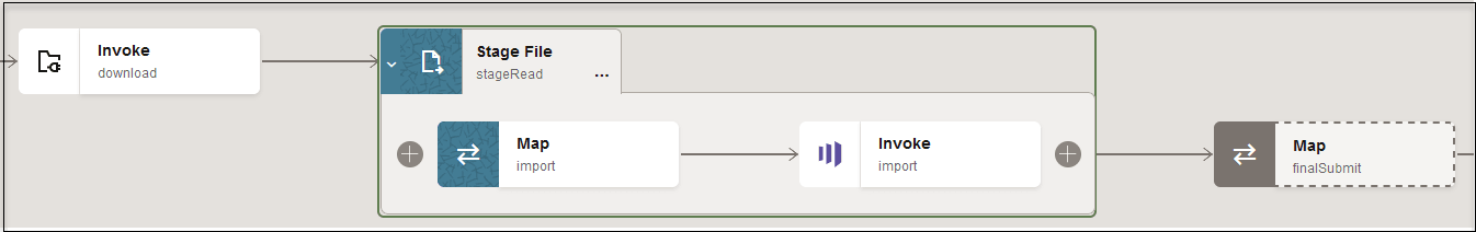 追加のアクションをステージ・ファイル・アクションのスコープ部分にドラッグして、タスクを実行できます。 たとえば、ステージ・ファイル・アクションにfor-eachアクションを追加して、大きなファイルのセグメント化されたチャンクを一度に1レコードずつ処理できます。 子ステージ・ファイル・アクションを追加して、各チャンクに対してさらに処理を実行することもできます。 ただし、子ステージ・ファイル・アクションで追加のチャンクを構成することはできません。