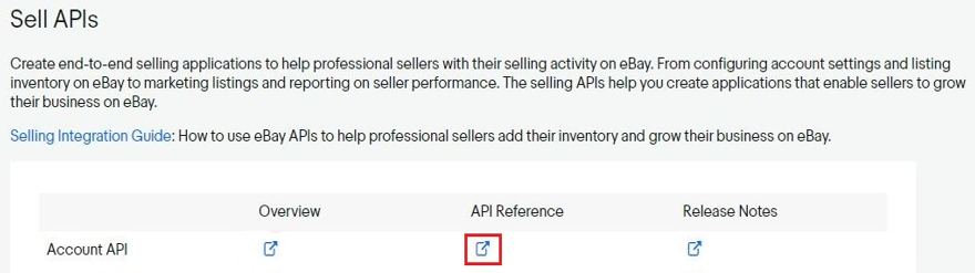 - 構成する必要があるAPIの「APIリファレンス」リンクをクリックします(たとえば、「アカウントAPI」)。