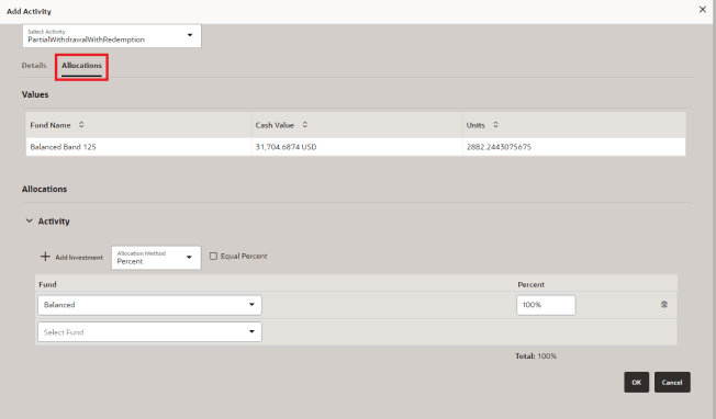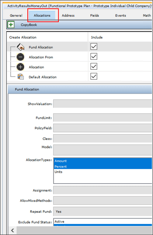 Allocations are the amount or percent of money that is applied to selected investment options for a policy. An example of an investment option could be mutual funds or money market accounts, which are called funds in the system. Policy holders or other requirements can direct how money is allocated to funds. Money is applied to allocation(s) by either assigning a percentage of the total amount or an exact value amount. Allocations can be individually selected funds or part of a model.