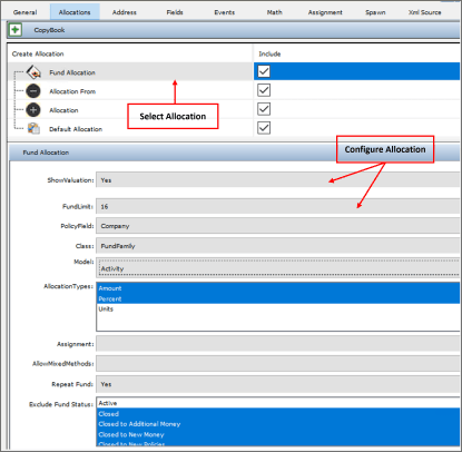 When setting-up allocations there are two ways to configure: insert an entire Allocation section from a CopyBook or configure the Allocation section through the Allocation pane.