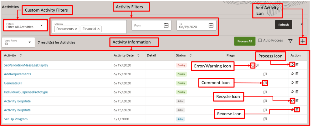 icon. Once, all the filter options are displayed, activities can be filtered on the Activities screen by selecting appropriate filter options. After selecting the filters, the user needs to click the Refresh button to apply the filters. Activities appear only if the filter options corresponding to them are selected. This screen also contains the processing options