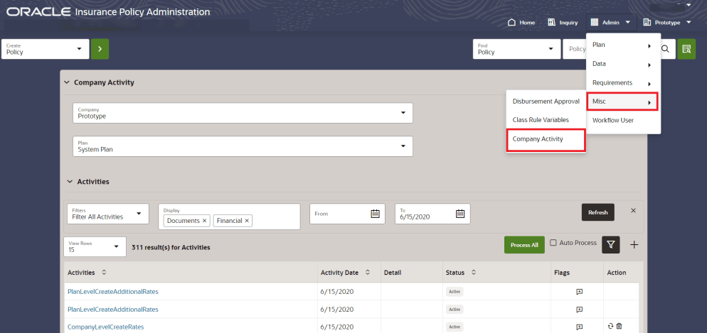 The Activity screen is located in the Oracle Insurance Policy Administration