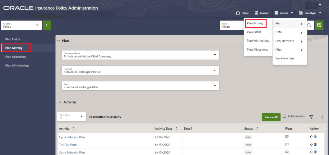 To access plan level activities, navigate to Admin Menu > Plan > Plan Activity. The Plan Activity screen appears. Select the required company and plan, then the corresponding activities appear.
