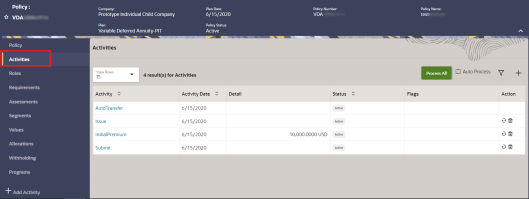 The Activities screen displays activities added to the policy. The view of the activities can be modified by activity status and date filters.