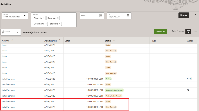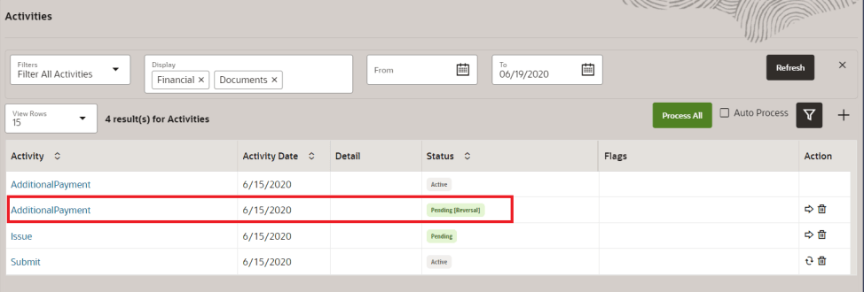 additional activities to be processed. The first is a reversal activity that has Pending [Reversal] status. The second activity is the new activity that has Pending status and it replaces the original activity when the reversal activity is processed.