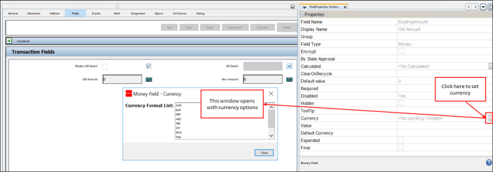 Configure a transaction to always use a specific type of currency. Check-out the transaction and click the Fields pane. When the money field is clicked, the Field Properties window will open. Scroll through the properties to the Currency field. Select the currency from the drop down box. The currency set here will determine the currency that the OIPA user will see when processing this transaction.