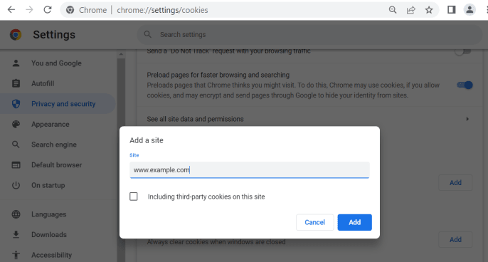 Google Chrome: Navigate to Settings > Privacy and security > Cookies and other site data. In the Sites that can always use cookies section, click Add. The Add a site page appears. Enter the Oracle Insurance Calculation Engine server address and, then click Add.