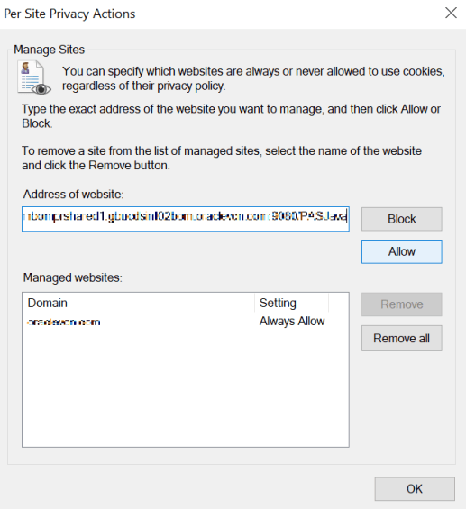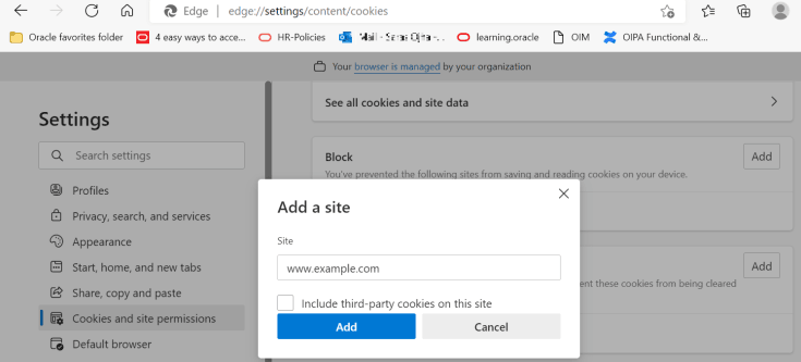Microsoft Edge: Navigate to Settings > Cookies and site permissions > Manage and delete cookies and site data, then in the Allow section, click Add. The Add a site page appears. Enter the Oracle Insurance Calculation Engine server address and, then click Add.