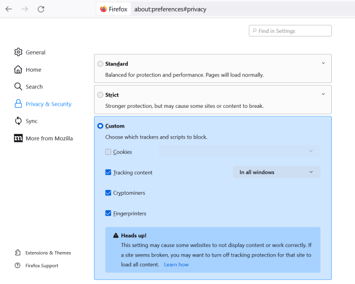 Mozilla Firefox: Navigate to Settings > Privacy and Security, then select an appropriate option that allows Oracle Insurance Calculation Engine cookies.