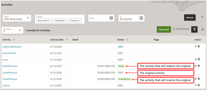 additional activities to be processed. The first is a reversal activity that has Pending [Reversal] status. The second activity is the new activity that has Pending status and it replaces the original activity when the reversal activity is processed.