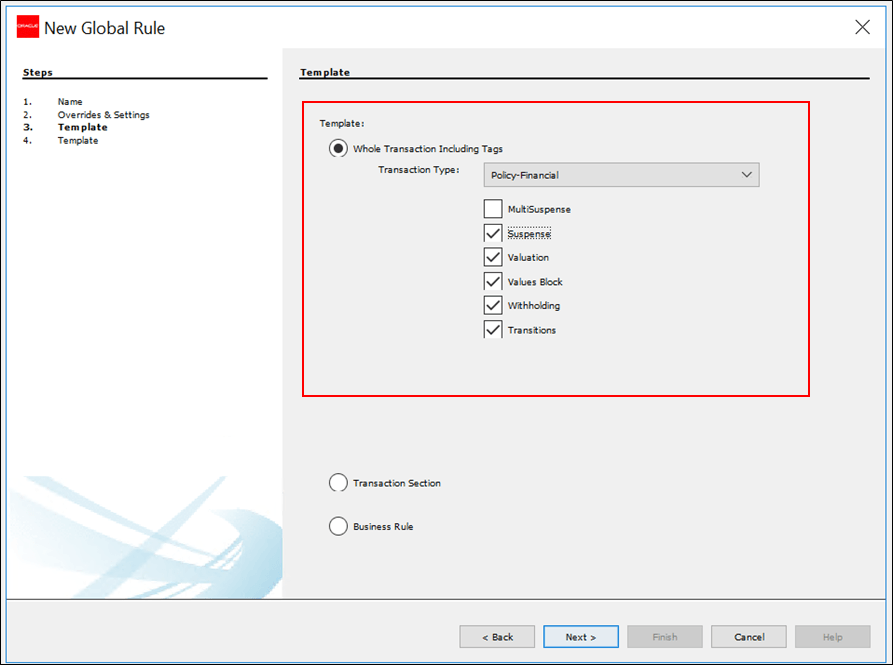 At this point there is the option to copybook an entire transaction, a specific section of a transaction, a specific business rule or part of a business rule.