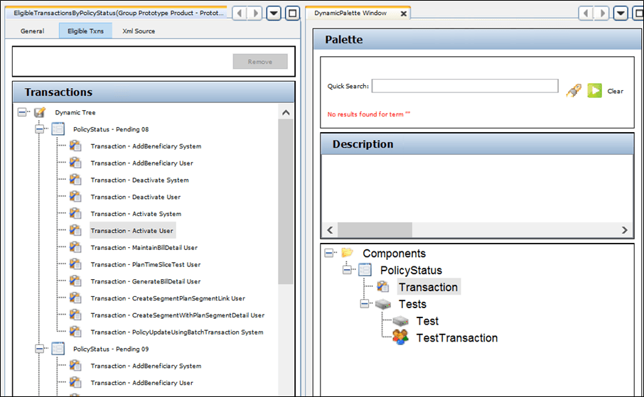 The Eligible Txns Pane allows for the visual editing of this rule. Drag and drop from the Components listed in the Palette window to the Transactions section of the Configuration Area.
