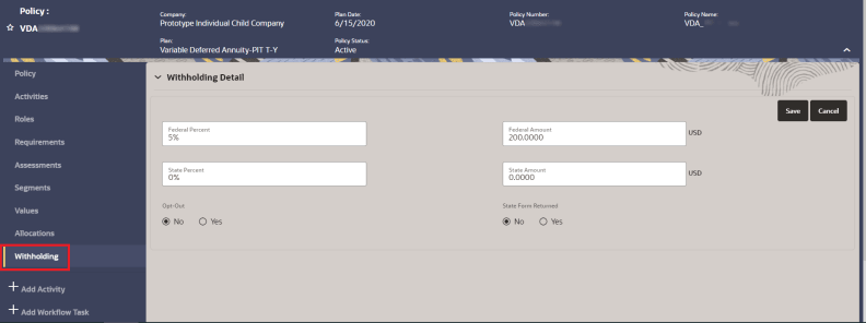 Withholding tab on a Variable Deferred Annuity Policy in OICE