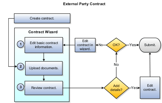 次の図は、外部パーティ用の契約ウィザードを使用して契約をオーサリングするプロセスの概要を示しています。