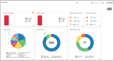 ホーム・ページまたはナビゲータの作業領域アイコンを使用して作業領域を開くことができます。 作業領域を開くと、ランディング・ページが表示されます。 ランディング・ページには通常、データの要約が表示されており、詳細にドリルダウンできます。 多くの場合、様々な検索やフィルタを実行したり情報タイルをクリックして(ランディング・ページにある場合)、表示されるレコードを変更できます。 作業領域をいくつか見てみましょう。