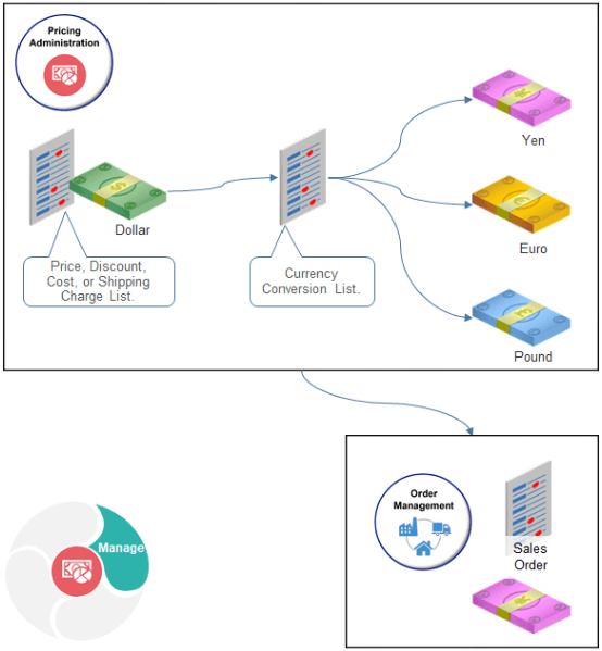 価格設定が実行時に価格を計算するために使用する通貨および換算ルールを設定し、Order Managementなどの価格詳細を必要とするアプリケーションで、使い慣れた通貨で価格を表示できます。