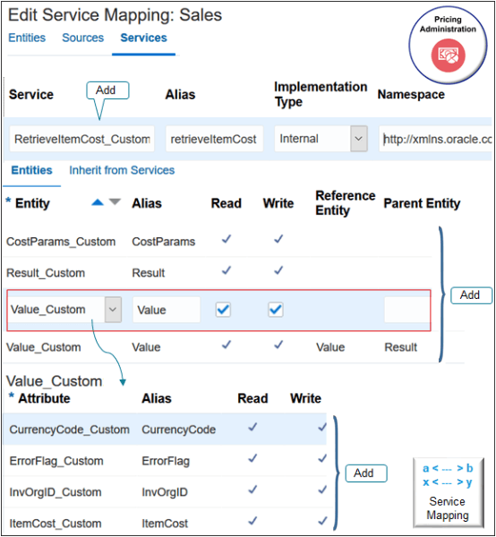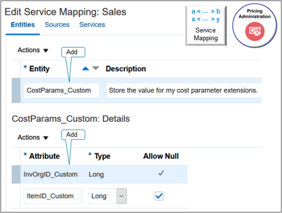 Oracle Pricingの外部にあるシステムを特定するエンド・ポイントを指定し、サービスと詳細の通信に使用するエンティティを指定します。