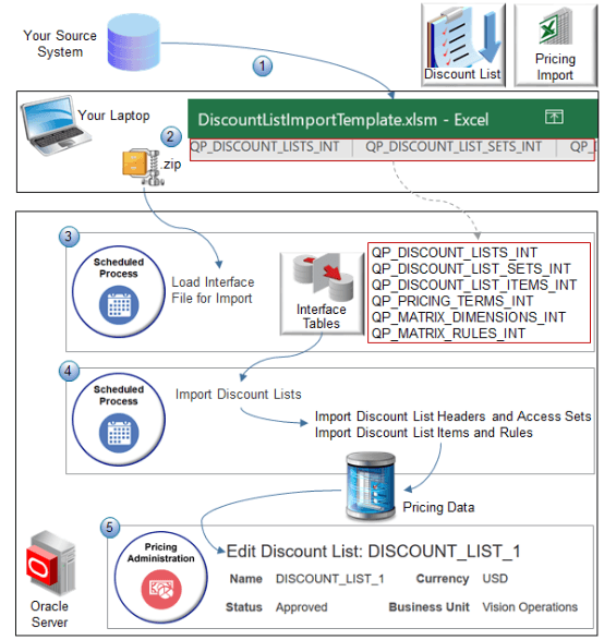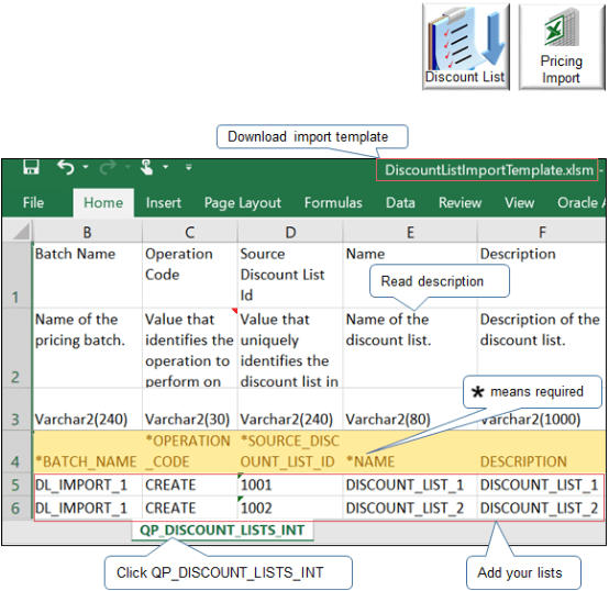 DiscountListImportTemplateの各ワークシートは、インタフェース表を表します。 たとえば、QP_DISCOUNT_LISTS_INTシートでは、OracleサーバーのQP_DISCOUNT_LISTS_INTインタフェース表で使用される構造と同じ構造が使用されます。 インポート用のインタフェース・ファイルのロード・プロセスでは、zipファイルからインタフェース表にデータがインポートされます。