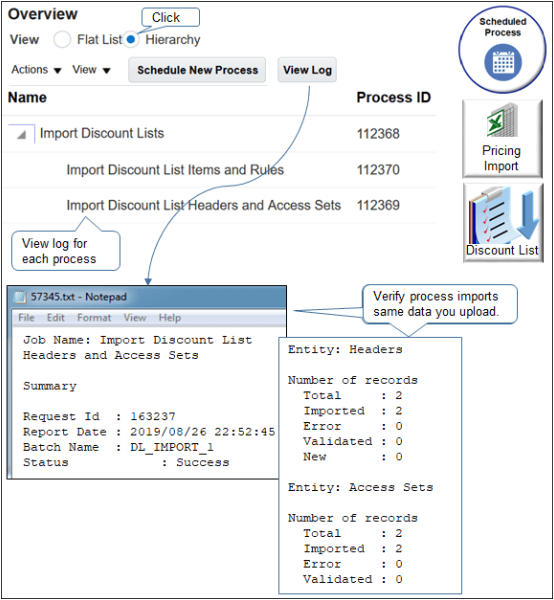 「割引リストのインポート」スケジュール済プロセスを実行します。 この親プロセスでは、2つの子スケジュール済プロセスが作成されます。