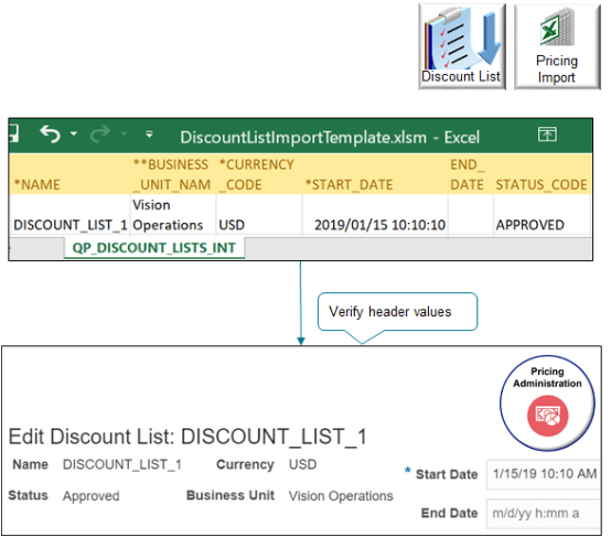 インポートを完了してから、価格設定管理作業領域に移動し、インポートによって名前、ステータス、通貨、ビジネス・ユニット、開始日などの割引リストおよびヘッダー値がQP_DISCOUNT_LISTS_INTワークシートからインポートされたことを確認します。