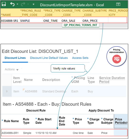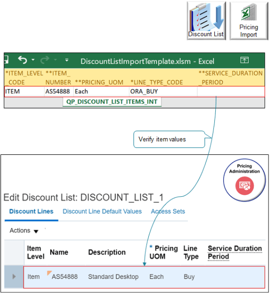 QP_DISCOUNT_LIST_ITEMS_INTワークシートからインポートされた値(品目レベル、名前、価格設定単位、明細タイプなど)がインポートされたことを確認します。