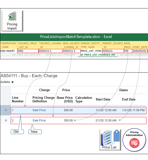 - 「更新操作」。 QP_PRICE_LIST_CHARGES_INTワークシートのCHARGE_LINE_NUMBER属性を、価格表のこの手数料についてOracleデータベースの手数料明細番号属性にすでに含まれている値と同じ値に設定する必要があります。 インポートでは通常、ソース手数料ID属性を使用してレコードを識別します。 インポートでレコードを識別できない場合は、手数料明細番号を使用してレコードを識別します。