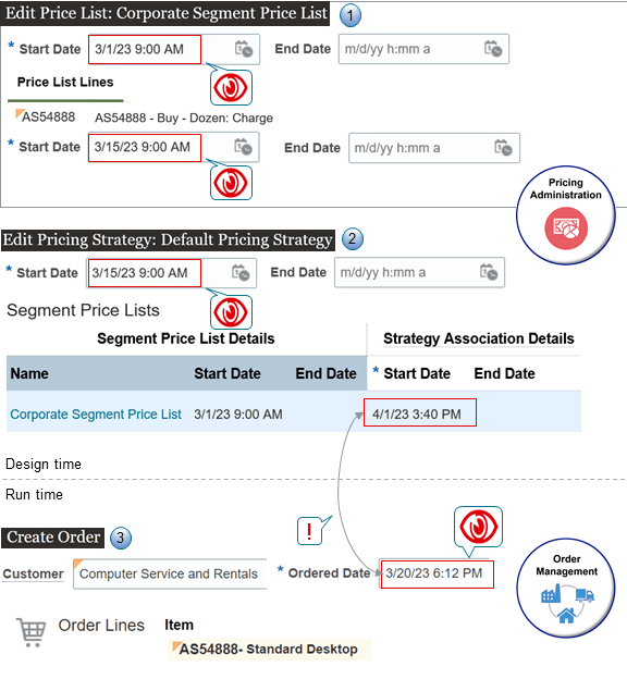 価格設定では、Header.PriceAsOf日付属性のランタイム値を使用して、戦略、戦略割当、プロファイル、マトリックスおよびルールがオーダーの価格設定時に有効であるかどうかを判断します。