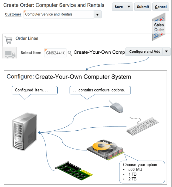 構成品目の例および販売オーダーに品目を追加する方法を次に示します。