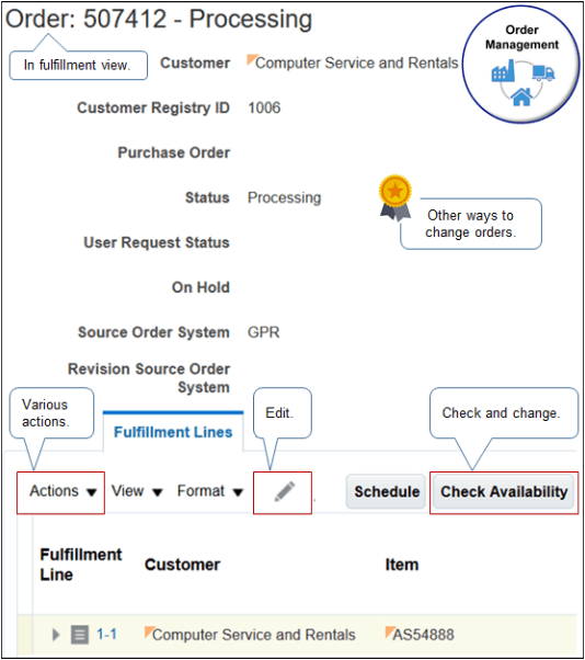 「オーダー管理」作業領域に移動し、「処理」→「履行ビューに切替」をクリックします。