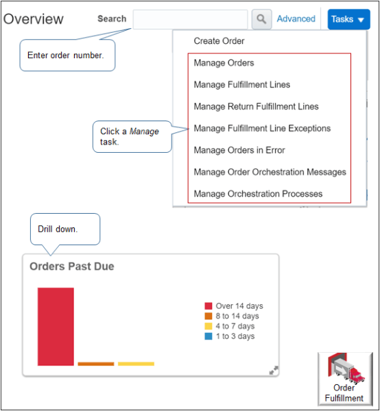 履行ビューを使用して、オーダー履行をモニターして管理します。 販売オーダーを履行するためにOrder Managementが追加したオーダー明細やオーケストレーション・プロセスなど、オーダー変換の結果が表示されます。