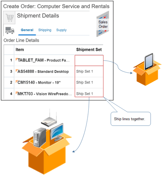 オーダー管理は、コンピュータ、モニター、モデムを1つの出荷で出荷し、タブレットをもう1つの出荷で出荷します。