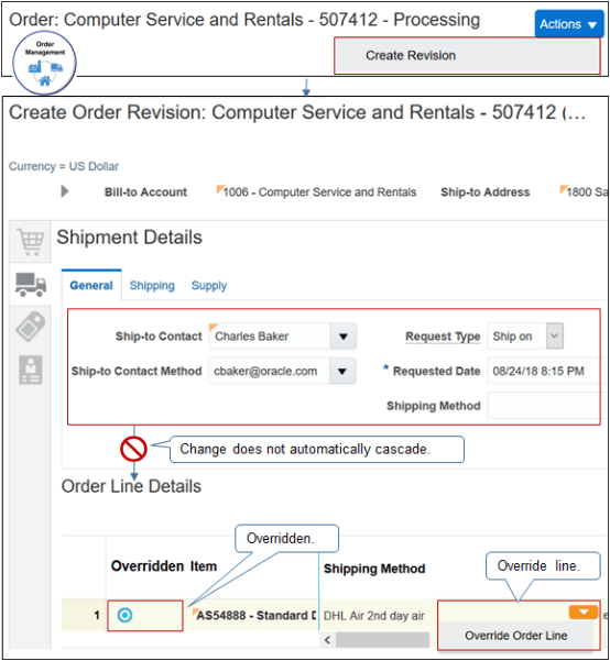 たとえば、「一般」タブのヘッダーで「出荷方法」を変更した場合、オーダー管理は「オーダー明細詳細」領域の「出荷方法」の値を自動的には変更しません。