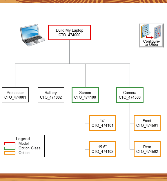 Vision Operations組織で、ラップトップ・コンピュータの構成モデルであるCTO_474000を販売するとします。 部品構成表を次に示します。