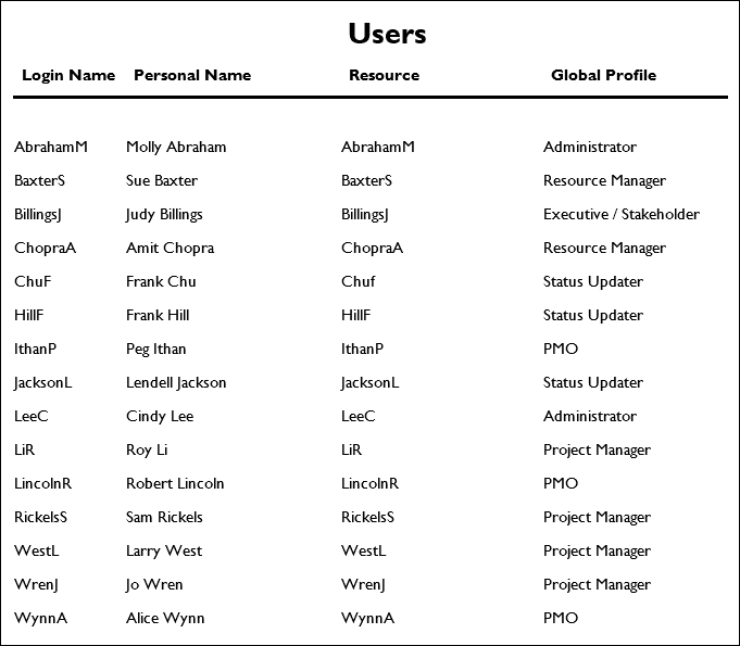 Répertorie tous les utilisateurs en indiquant leur nom ainsi que le profil de ressource et de sécurité global qui leur est associé.