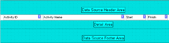 Detail Area: This area contains the bulk of the project data that are being reported and is the only area of the report to which you can add a data source. The data source indicates which category of database information the report compiles, for example, activity resource assignments or cost accounts. After selecting a data source, you add rows, and then cells within the rows, to the Detail Area. The cells specify the individual data fields you want to report for the data source you have selected. For example, in the following graphic, the data source is Activities. The row between the Data Source Header and Detail areas contains four field data text cells: Activity ID, Activity Name, Start, and Finish. In this example, the report will list the activity ID, activity name, start date, and finish date for all activities in the open project.