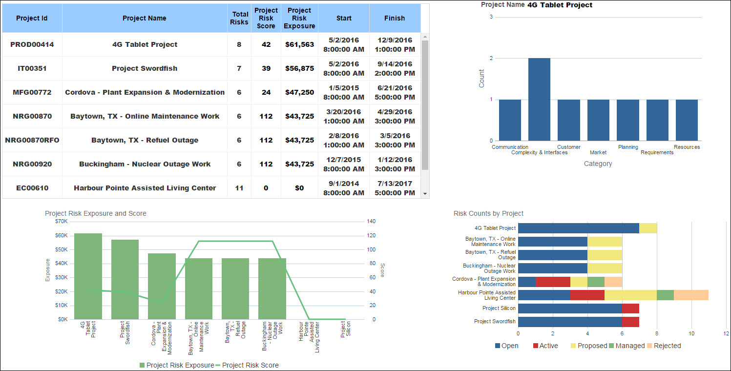 The bar chart shows risk counts by project and uses master-detail linking to display the counts for a project based on the Project Name that is clicked on in the table. The counts are by Cost Category.